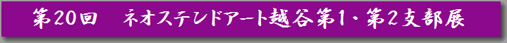 新緑の美しさに心弾む季節となりました。 本日はお忙しい中、ご来場戴き有り難うございます。 平成6年「時の記念日」の日から歩み始めた越谷支部展(越谷第一・第二合同展)は途中、東日本大震災の年にやむなく中止いたしましたが、今年記念すべき第20回展を迎えることができました。 一口に20年と申しますが、振り返りますとさまざまな思い出が走馬灯のように蘇ってまいります。 ご友人、ご家族、ネオステンドを学ぶ他支部の同士の皆様、今までこの会場にお越し戴きましたすべての方々に心より御礼申し上げます。 私達の思いはひとつ、ひとときでも、あなた様の心の琴線に触れて和んで戴く事ができましたら、このうえもなく幸せでございます。お互いさま健康に気をつけ、これからも「善きおつき合い」をとお願いする次第です。 ご後援、ご協力戴きました関係各位の皆様に御礼申し上げます。 平成26年5月吉日 ネオステンド・アート協会 越谷第一・第二支部 支部長・講師・会員一同 |