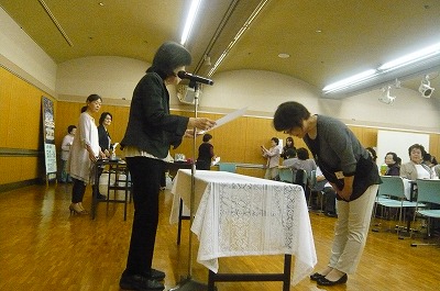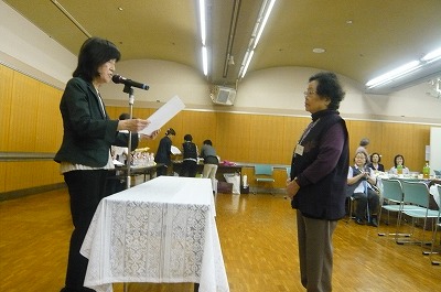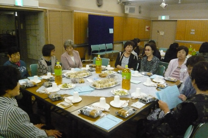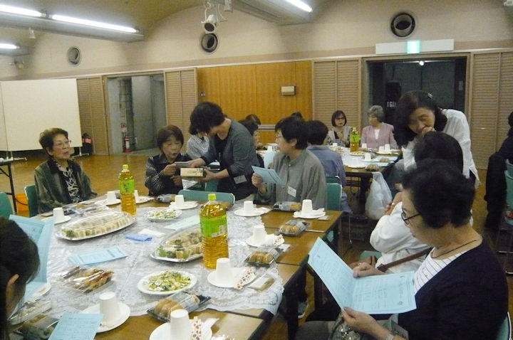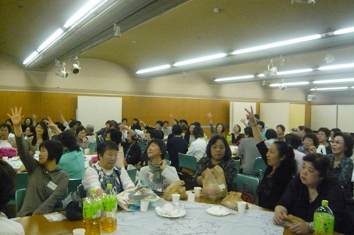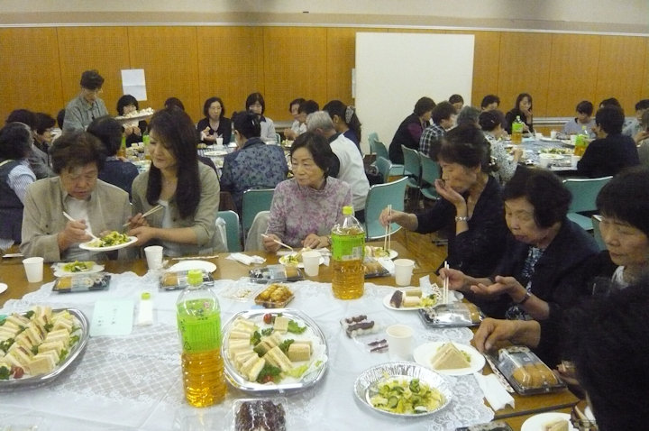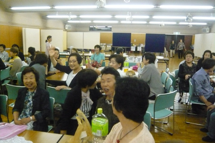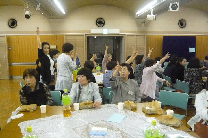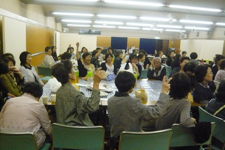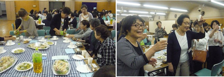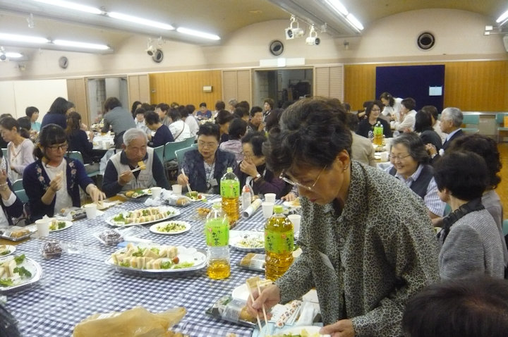 ◆懇親会◆ お茶で乾杯してから、会食、じゃんけん大会と続きます。 画像をクリックすると拡大します。(約100名なんですけど、皆さんが写せているかしら?) | ||||