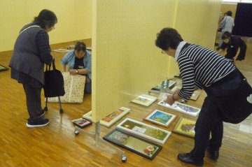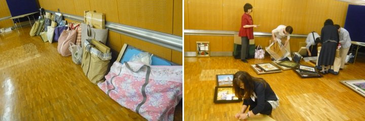 パネルや机の配置が終わったら持ってきた作品の荷物をほどきます。 テーマ位置に作品を運び床におきます。実はこの後、壁面用のワイヤの組み立て、額縁が曲がらないように飾り付け、作者と作品名のカードを貼り、部屋全体での絵のバランスをとります。これが最も時間がかかります。先生はその前の準備段階でカードも作成しているのです。 |