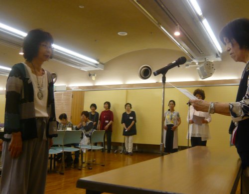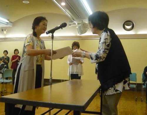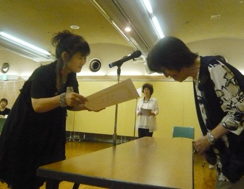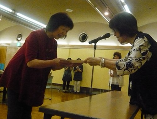 5年毎連続出品者の表彰です。最多年数は35年でした。全員で10名です。5年の人がいません。新入会員が入らないということではないでしょうか。ちょっと寂しいですね。賞品は樹脂液です。(写真は3秒ごとに変わるスライドショーです。) | |