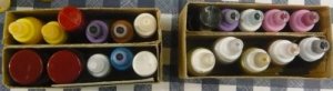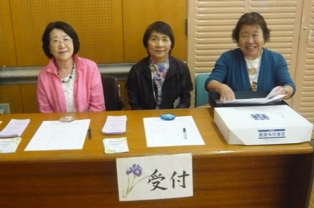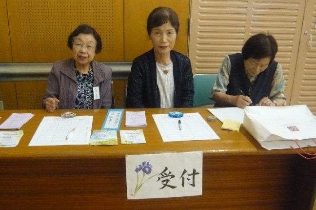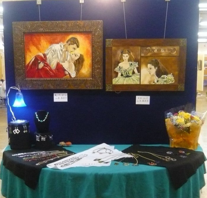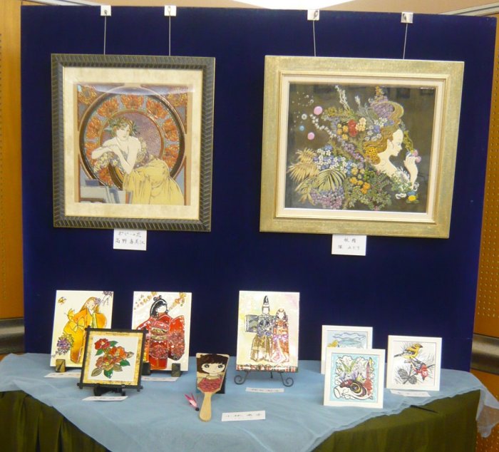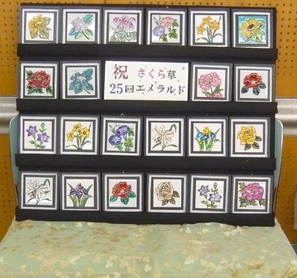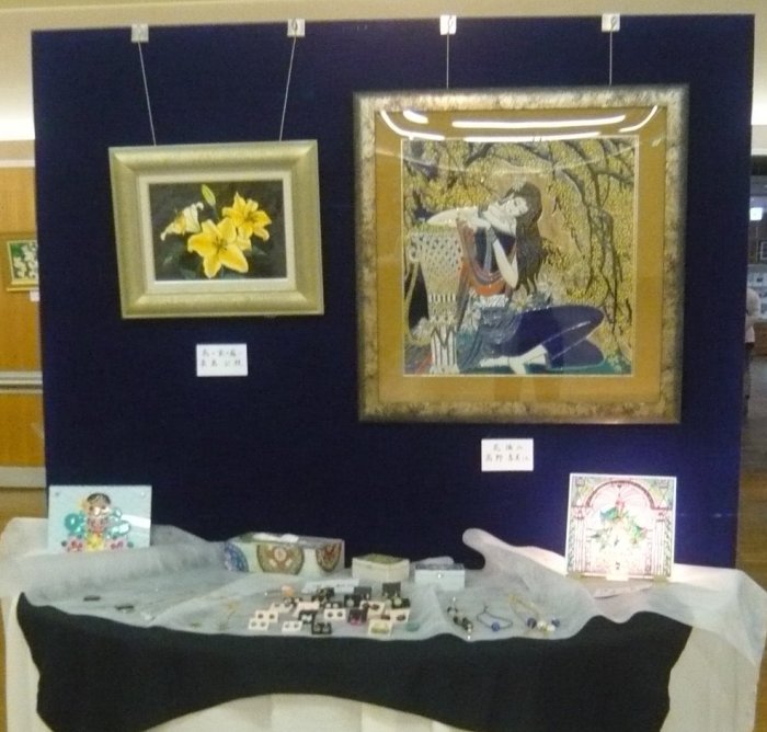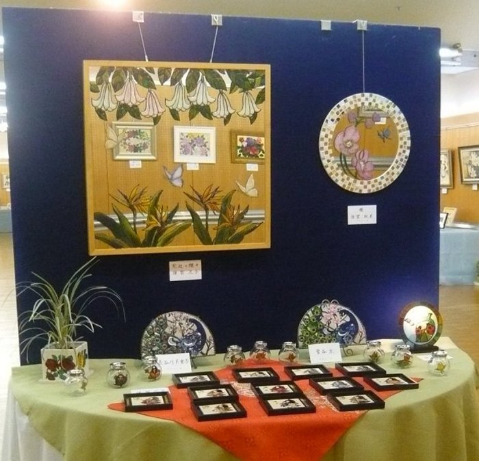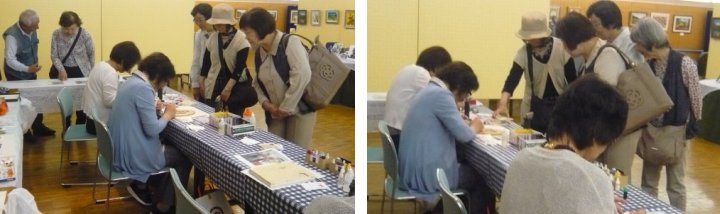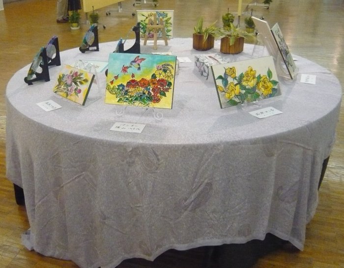 体験をやめた代わりに、実演コーナーを開設して2年目です。 作業中の先生方です。見本ではキャンバスがガラスですが、実演では板や布キャンバス(?)、タイルだったと思います。およそ何にでも描ける良い例ですね。 赤い〇で囲んだ絵具入れは、段ボールで手製なんですね。100均の容器を使い、いつも絵具が引っ繰り返っている私としては是非真似をしたいです。![]() 個別テーブル(ここの写真はクリックで拡大します。) | |